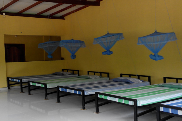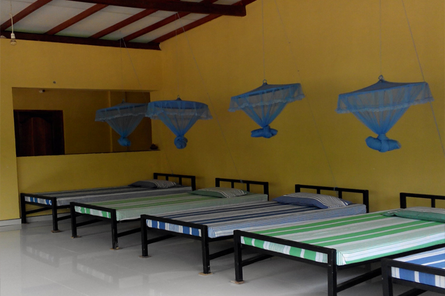 We have 10 Dorm beds with mosquito nets in half-wall open-air space.